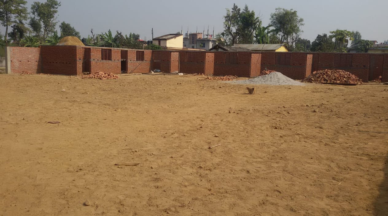 Die Klassenzimmer sind schon unter Dach, der Zaun großteils fertig - Anfang März 2019