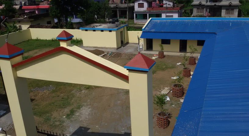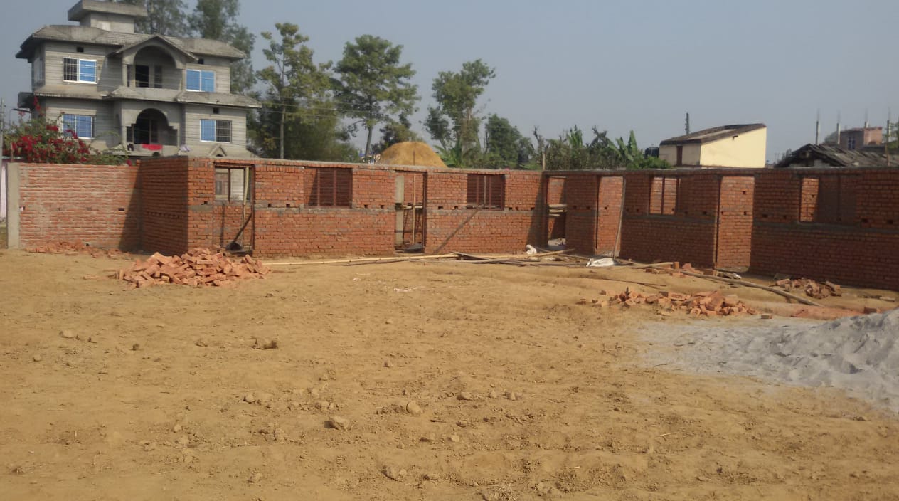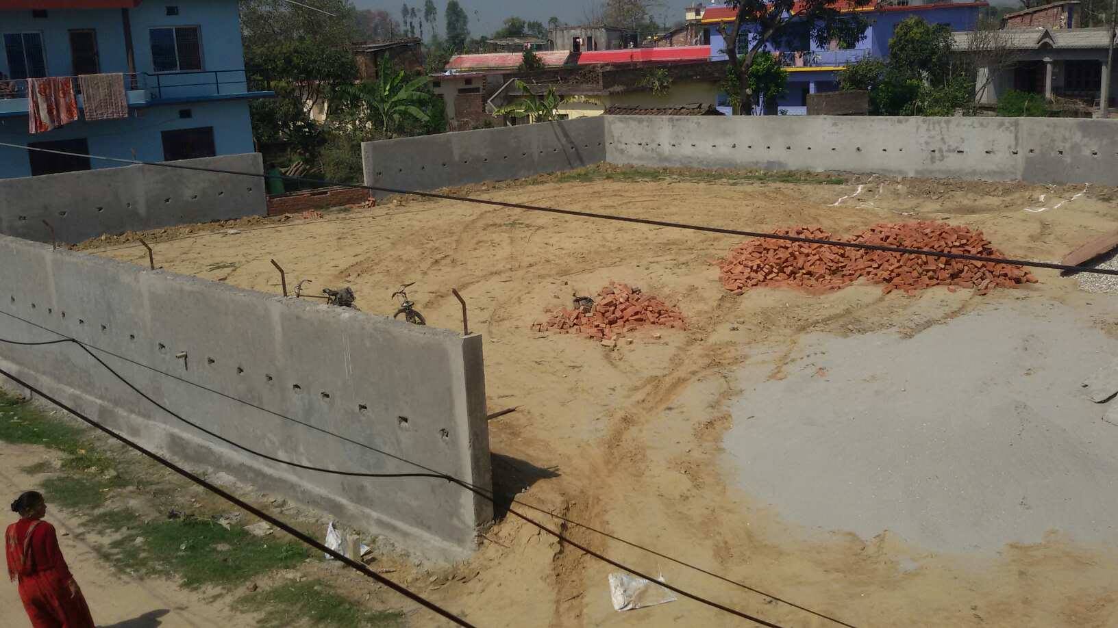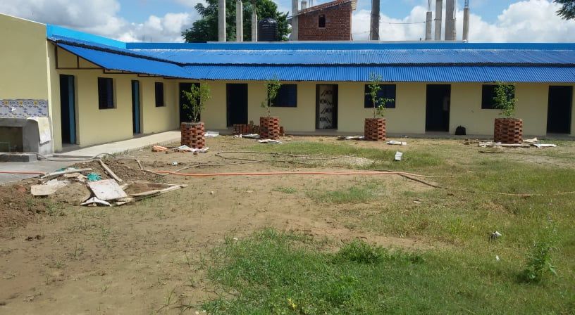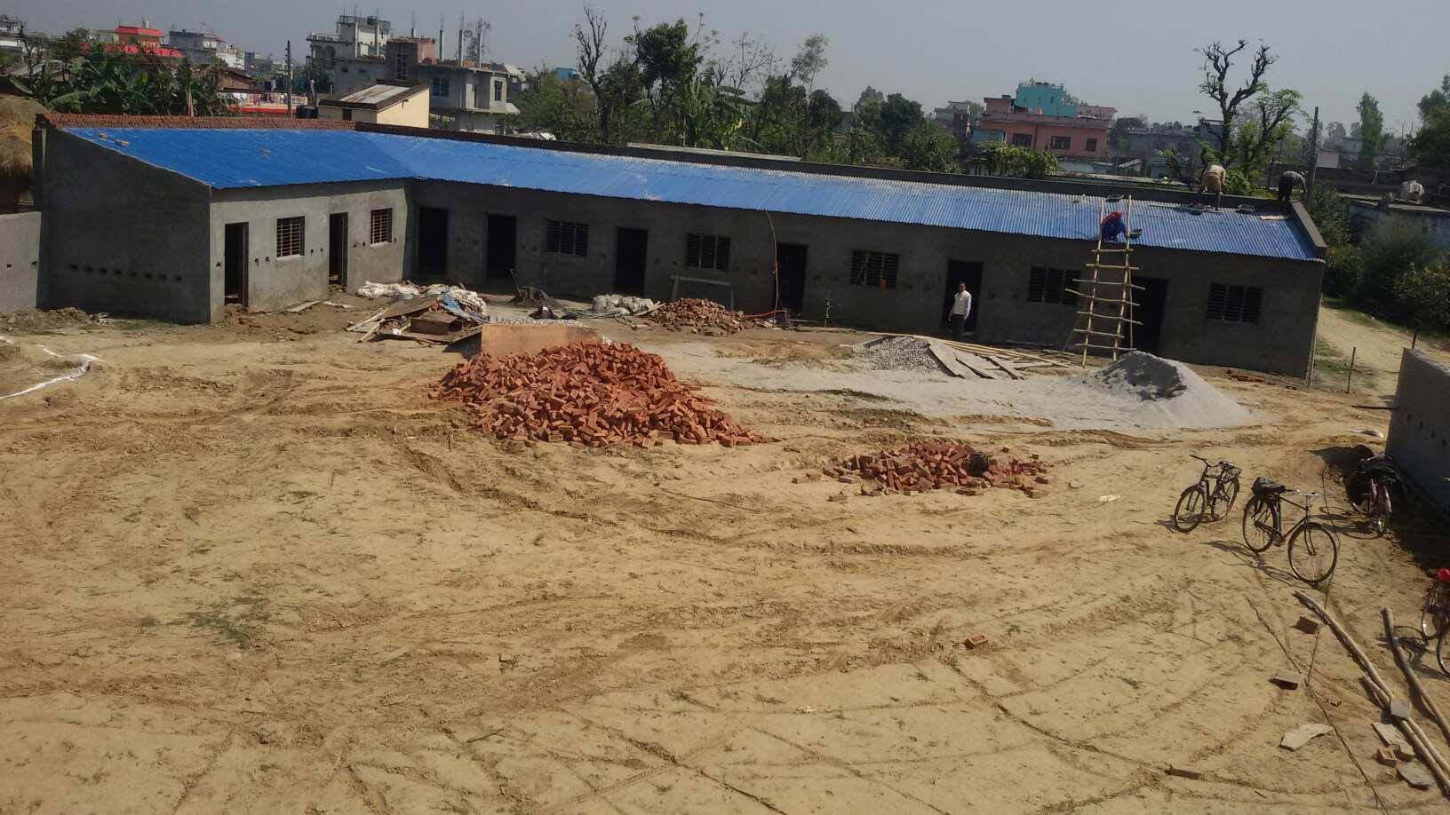 Die Klassenzimmer sind schon unter Dach, der Zaun großteils fertig - Anfang März 2019